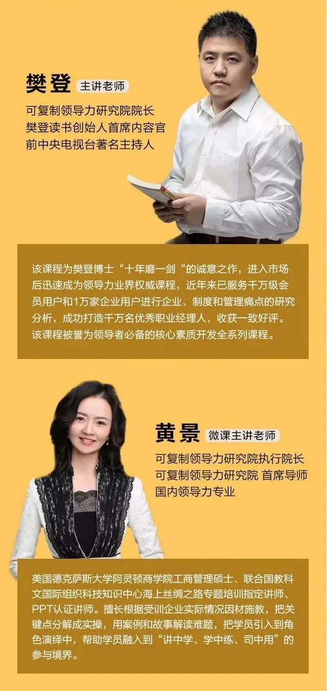 可复制领导力研究院由樊登博士担任首任院长,樊登博士十年磨一剑,研发打造“可复制领导力”课程,以“为中国培养合格职业经理人”为使命,致力于打造职业经理人的终身学习平台。