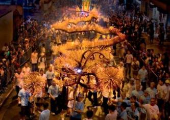 中秋夜幕来临之时,在香港铜锣湾大坑地区的浣纱街,便可看到由数百人合力挥舞、长达60多米的“火龙”,在进行舞火龙活动。“龙头”由藤条编织而成,“龙身”插满长长的寿香,整条“火龙”跟随着“龙珠”的引导,在锣鼓喧天的节奏声和烟雾缭绕的氤氲中,时而盘旋,时而飞升,腾云驾雾地前行,十分好看。游行结束后,插在火龙身上的线香会送给在场观众,象征着幸福的传递和延续。